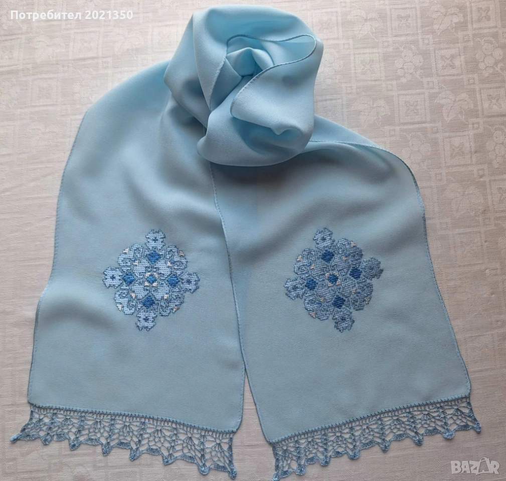 Ръчно бродиран копринен шал с български мотив и дантела → Обява 38561327