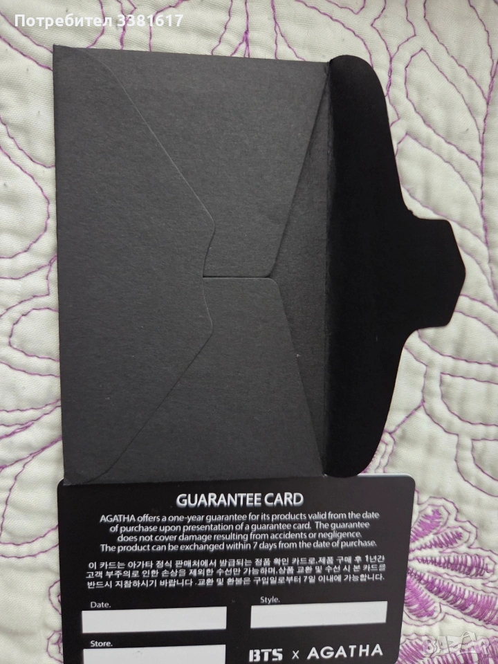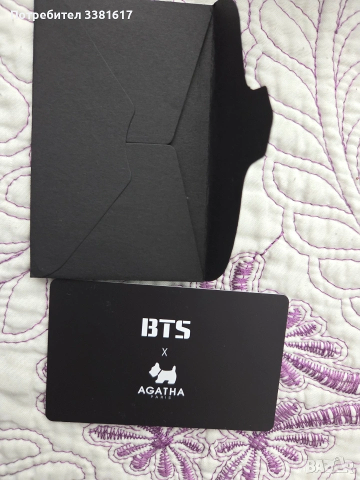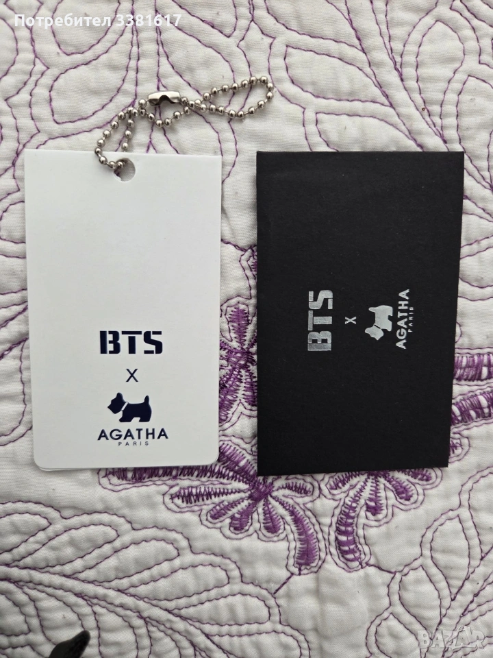 Поръчана е от eBay Корея. Не се намират на пазара, рядък артикул. Колаборация на BTS и Agatha Paris. Включва 2 несесера и нашивки. При интерес пишете ми за повече снимки. Изпращам с Еконт, опция преглед и тест, връщането е за сметка на купувача.