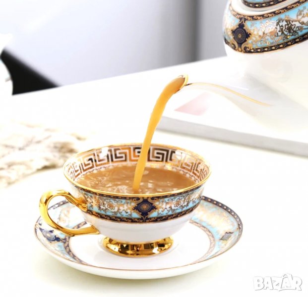 Стилен комплект от чаша, чинийка и лъжичка - 3 части в съчетание на цвят тюркоаз и злато.