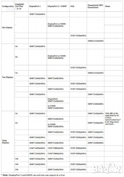 – DP2 / HDMI, Thunderbolt 3, and VGA: DP2 / HDMI 3840 x 2160 pixels / 30 Hz; Thunderbolt 3 3840 x