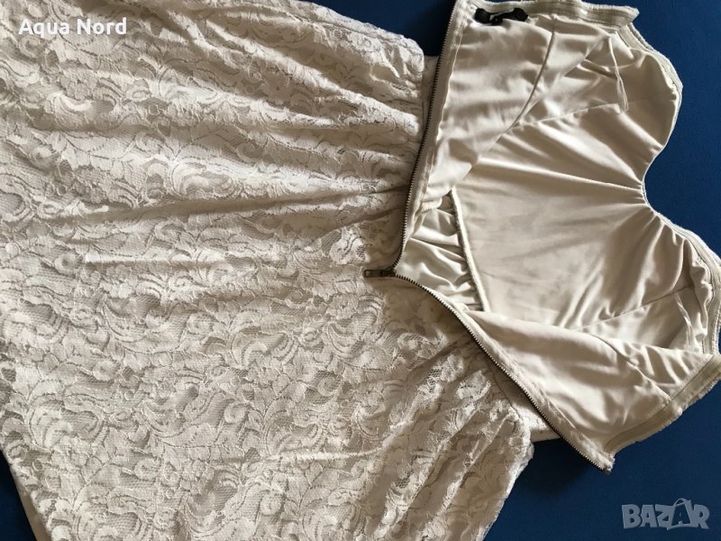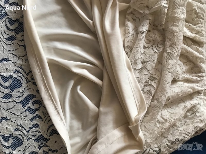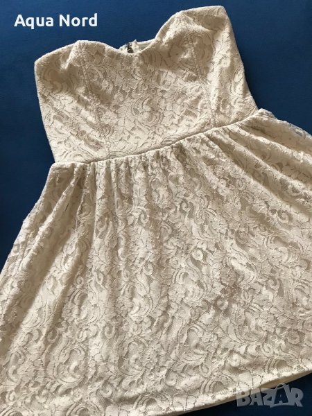 Дантелената рокля е в цвят екрю, няма презрамки, но прилепва плътно до тялото чрез специална лента в горната част.