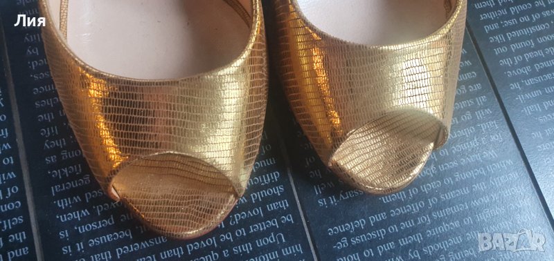 Нови.Мека естествена кожа с животински релеф. Цвят- злато. Височина на тока 10 см.