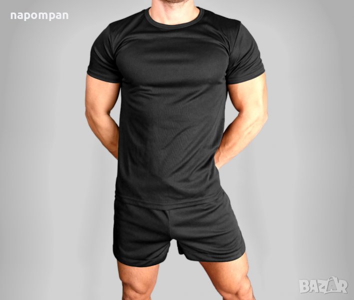 Мъжки черни изчистени комплекти от еластична и дишаща материя - тениска и къси панталони. Идеални за тичане, фитнес тренировка и ежедневна употреба. Устойчива на намачкване с добро проветряване, намаляващо изпотяването.