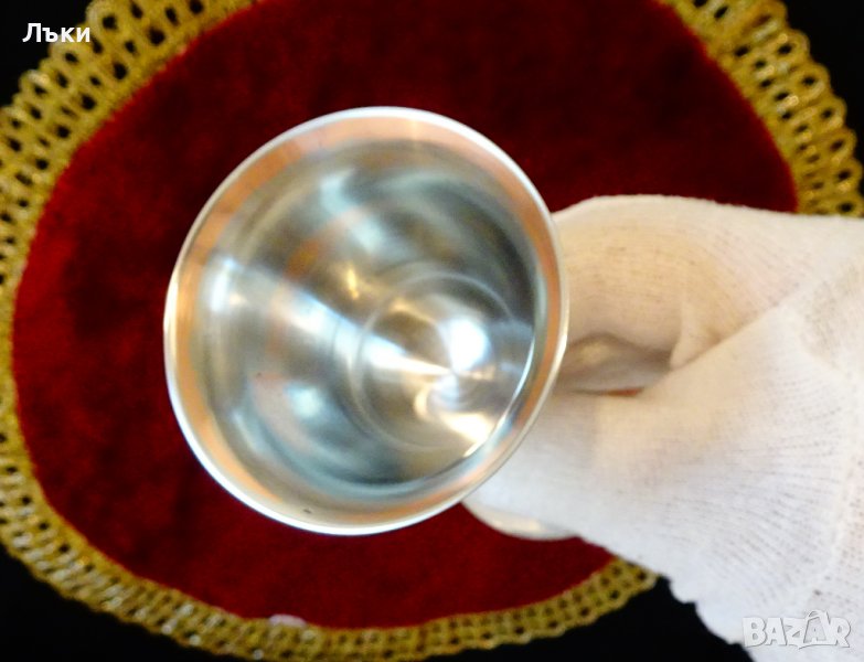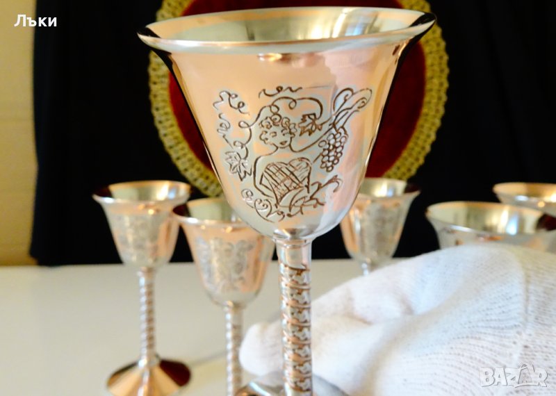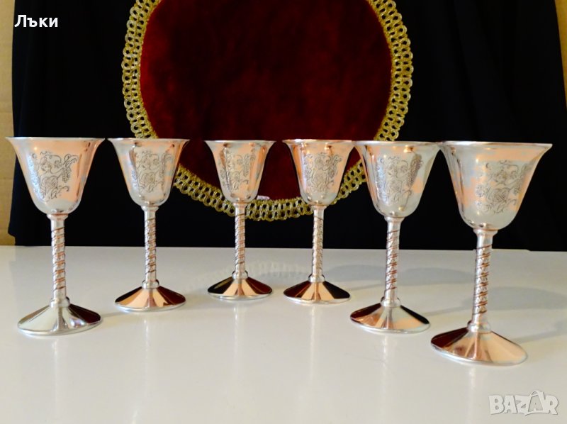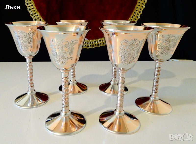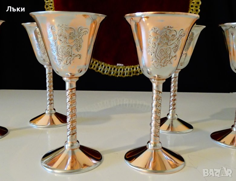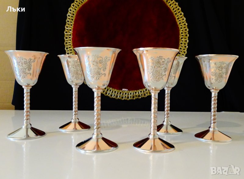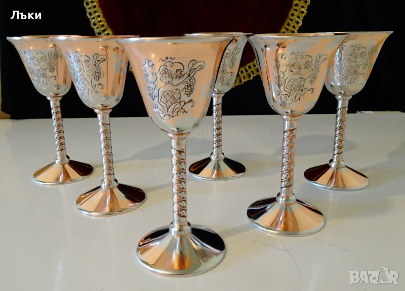 страни с красива Дама,която бере грозде.Изображението е подчертано с тънко посребряване.Чашите имат ефектно релефно столче.Масивни и звънки.Маркирани за произход.Височина 12 см.,диаметър 6 см.,тегло на всяка 95 гр.Вместимост 60