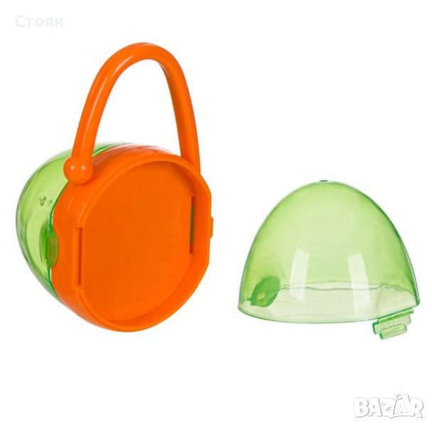 Двойна кутия за залъгалка, пластмасова (0% BPA) в зелен/оранжев цвят. Поддържа залъгалките чисти. Има стабилна кука, която може да се закачи на количката.