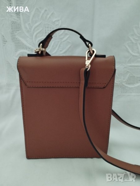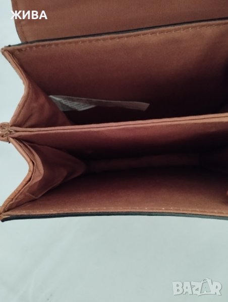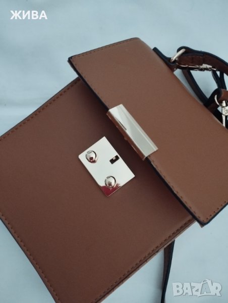 Малка дамска чанта през рамо, еко кожа, две вътрешни отделения, с дълга дръжка, която се сваля и малка дръжка.Чантата е с две вътрешни отделения, затваря се с капак с метална закопчалка, цвят кафяв. Височина на чантата 20см., ширина 18см., дръжка 120см., може да се регулира.
