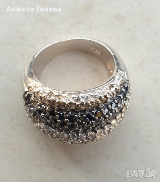 Масивен дамски пръстен изработен от сребро с бели и черни кристали Сваровски.