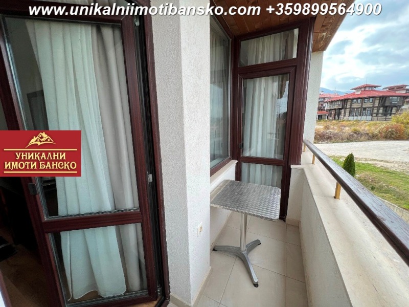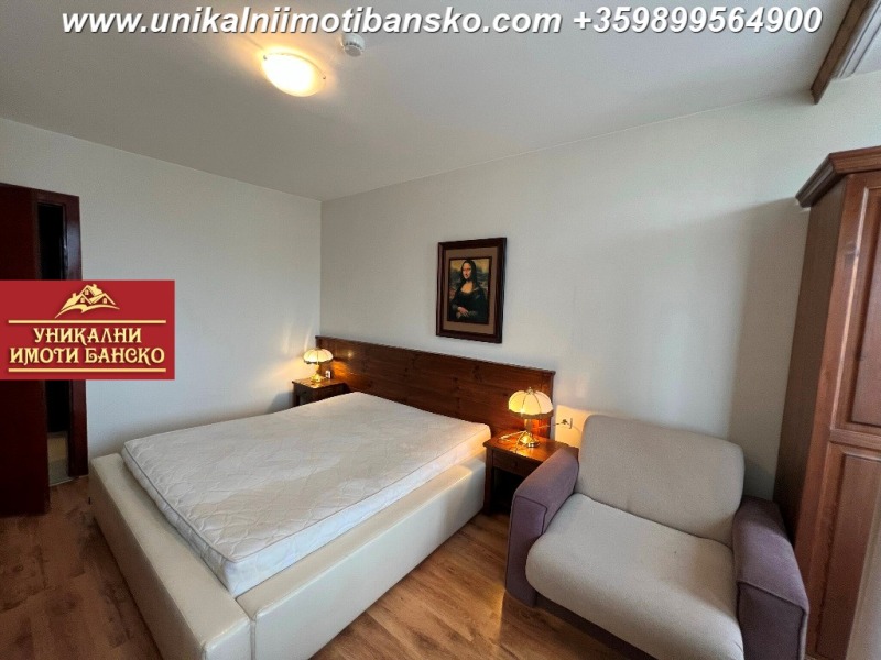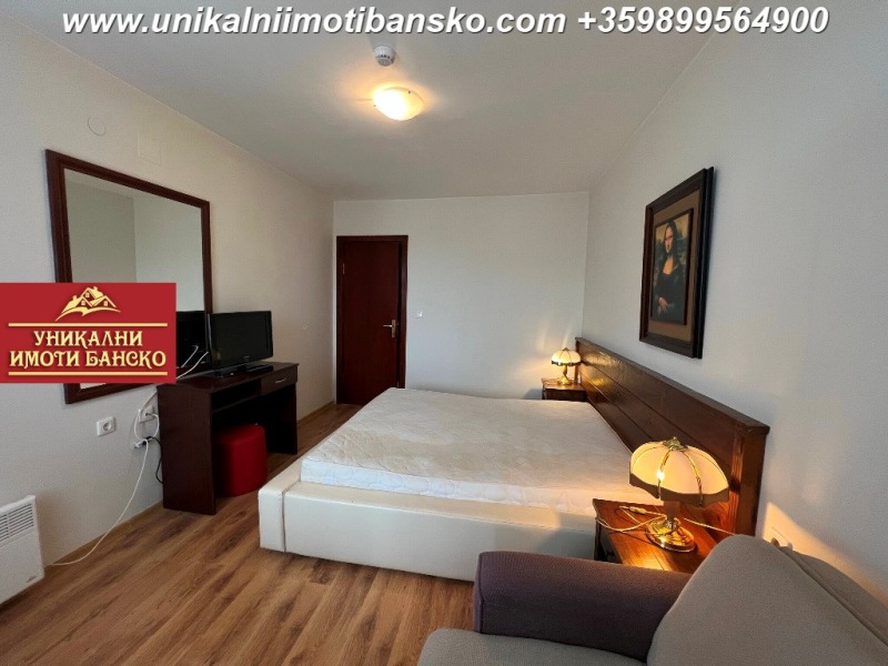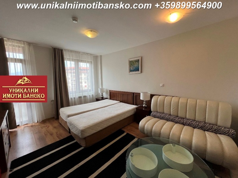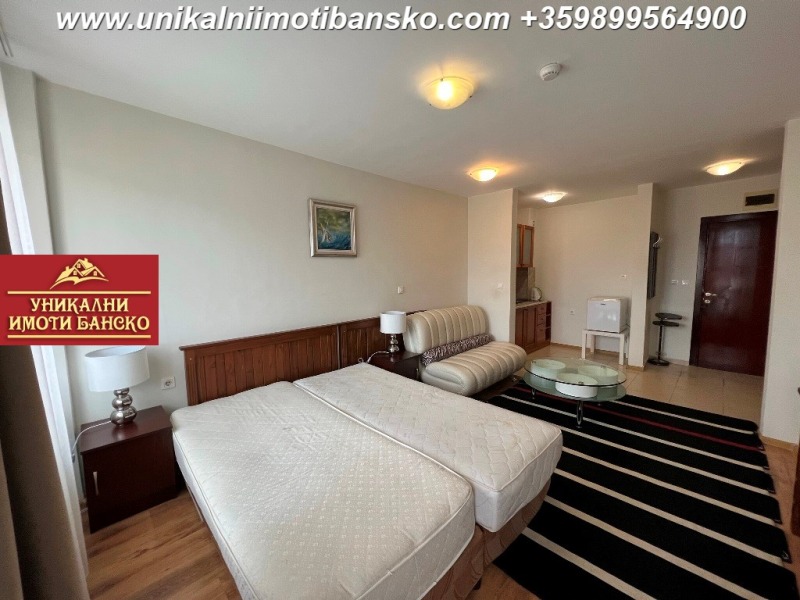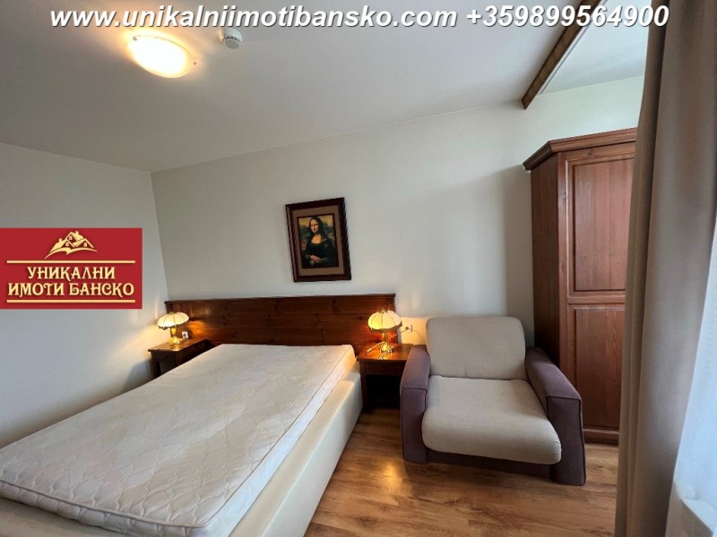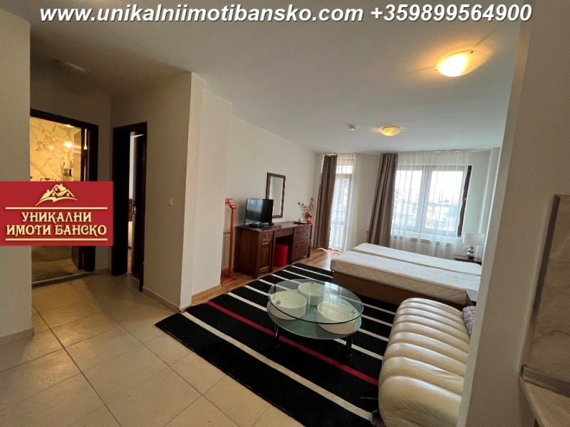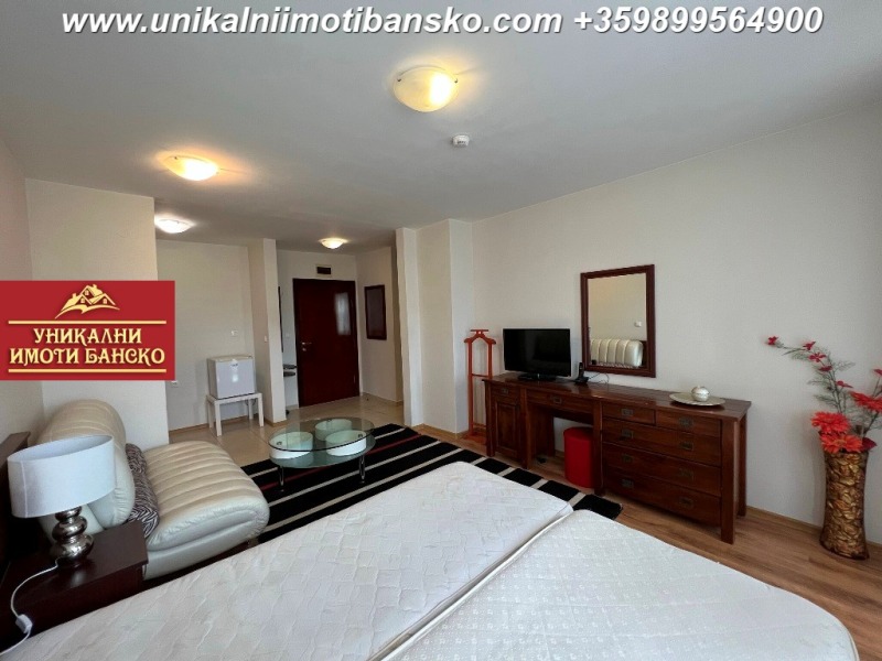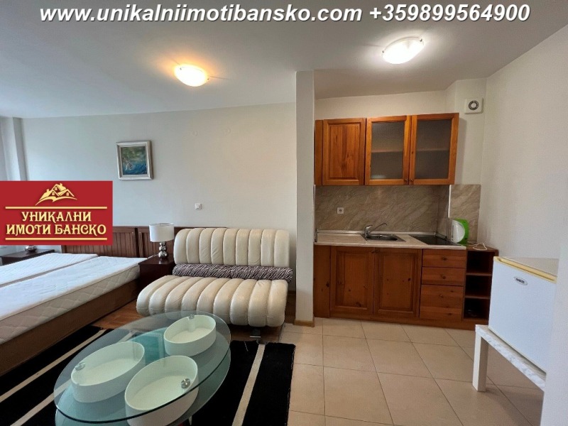 www.unikalniimotibansko.com БЕЗ КОМИСИОННА ОТ КУПУВАЧА! Агенция 'Уникални Имоти Банско' предлага за продажба НАПЪЛНО ОБЗАВЕДЕН И ГОТОВ ЗА НАНАСЯНЕ ДВУСТАЕН АПАРТАМЕНТ, РАЗПОЛОЖЕН В КОМПЛЕКС С ОТЛИЧНА ЛОКАЦИЯ - БЛИЗКО ДО СКИ ЛИФТА! Апартаментът е разположен на 2-ри етаж, като е съставен от просторна всекидневна с кухненски бокс, под който има поставен кожен диван с холна масичка, а под тях има голямо двойно легло, срещу което има ТВ шкаф с телевизор. Стаята има излаз към тераса, която е обща със спалнята. Спалнята е оборудвана с едно голямо двойно легло, гардероб, и тоалетка с телевизор, като мебелите в стаята са изработени от масивна дървесина. Жилището разполага с една баня, която е оборудвана с душ кабина и тоалетна. Услугите, които са включени в таксата поддръжка са включени почистване, поддръжка и осветление на общите части, асансьор, охрана, използване на СПА център с басейн и други. Страхотна инвестиция в имот, който може да ползвате както за постоянно живеене, така и за отдаване под наем!