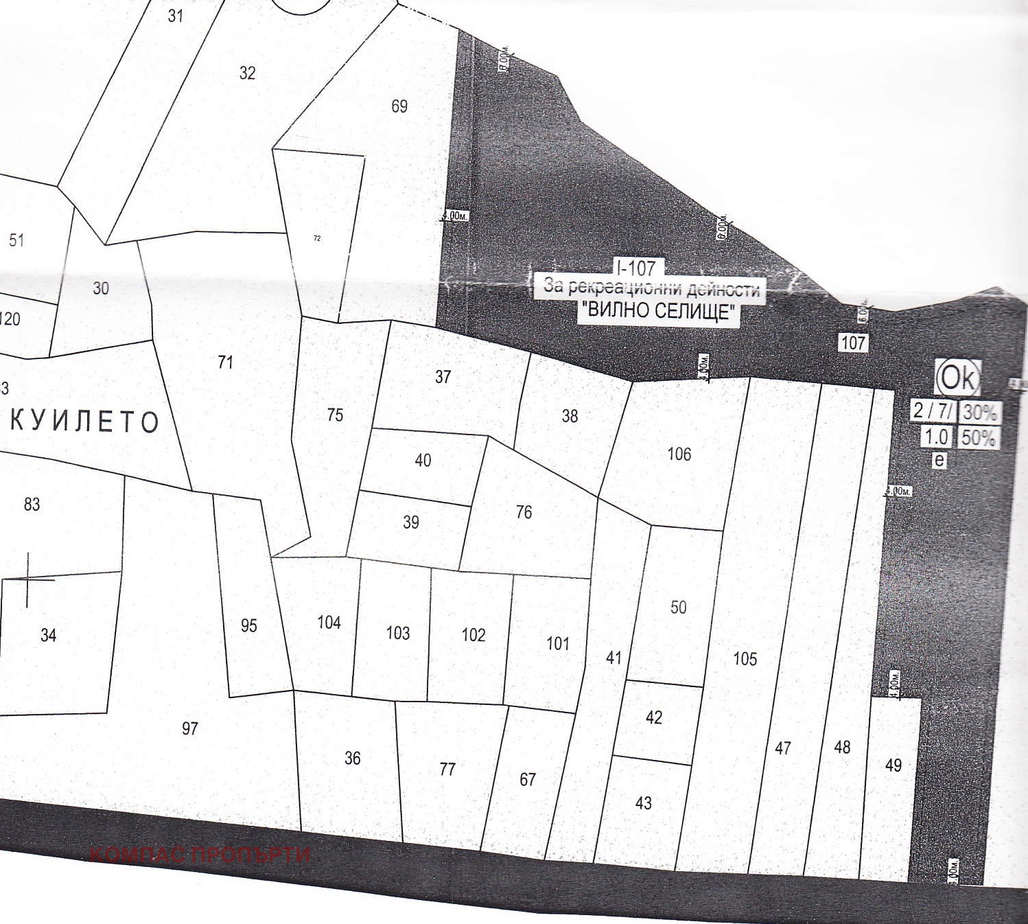 ОСОБЕНОСТИ: за рекреационна дейност ' Вилно селище'. Плътност 30%, кинт 1, кота корниз 7м