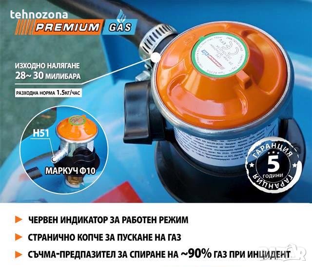 Редуцир вентил PremiumGas притежава съчма-предпазител за спиране на около 90% от подавания газ при инцидент. Редуцир вентил за ниско налягане PremiumGas е с перфектно качество и 5 години гаранция.