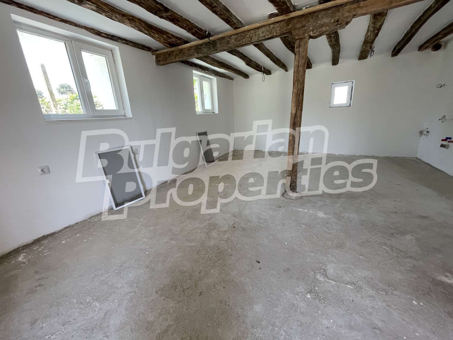 дървени греди на тавана и дървеното вътрешно стълбище(реновирани и обезопасени).