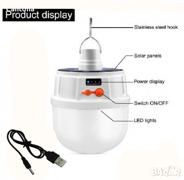LED лампа със студена бяла LED светлина, соларен панел от горния край, универсална лампа подходяща както за дома, така и за работилници, лаборатории, читални, хамбари, складове, мазета. Кука за закачане
