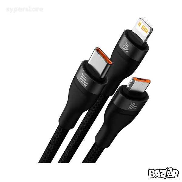 Кабел 3в1 Baseus CASS030201 Flash Series USB към USB-C + micro USB + Lightning 100W 1.5м черен