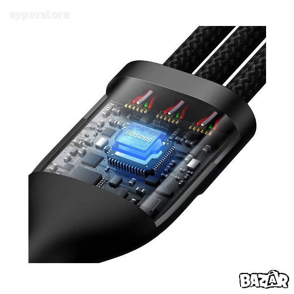 Кабелът Baseus е оборудван с 3 изходни порта и двоен входен порт, така че можете да зареждате 3 устройства едновременно и да спестите време. Той също така поддържа 100W бързо зареждане. Той се откроява със своята широка съвместимост и солидна изработка.