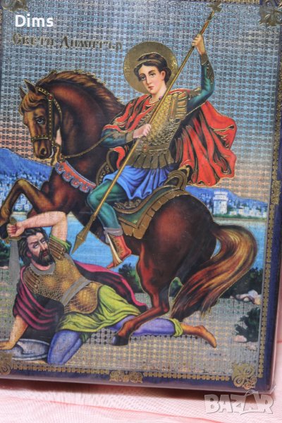 В по-ранната иконография Св. Димитър бил изобразяван допоясно или седящ на трон, с копие, пронизващ скорпион. След 16 век обаче светецът е представен като един от конниците на апокалипсиса – обяздил червен кон, пронизващ с копие някакъв символ на злото. В много български икони Св. Димитър пронизва Василий II Българоубиец или турчин. В гръцките икони пронизва българския цар Калоян, тъй като в Гърция вярват, че именно покровителя на Солун – Св. Димитър, опазва града при обсадата му от цар Калоян през 1207 година. В Русия на иконите Св. Димитър пронизва татарин. Православната църка, с цел изглаждане на възможните националистични тълкувания, приемат, че жертвата на Св. Димитър е антихристът.