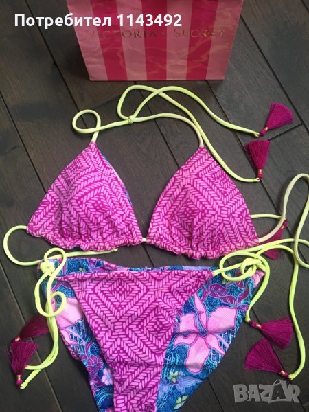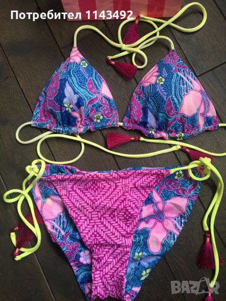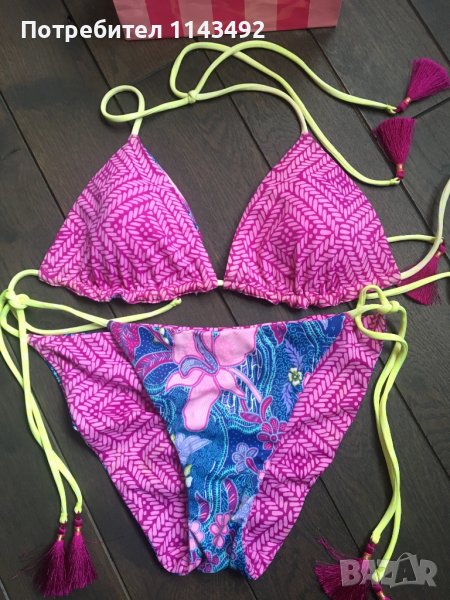 Двулицев бански Victoria’s secret, в бонбонени цветове, с пискюлчета на връзките, С размер, може да се носи в четири комбинации, подарък ми е, не е мой тип, нов