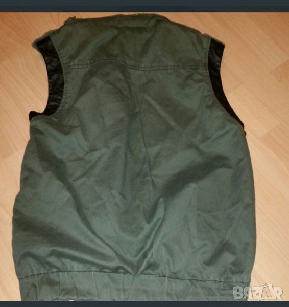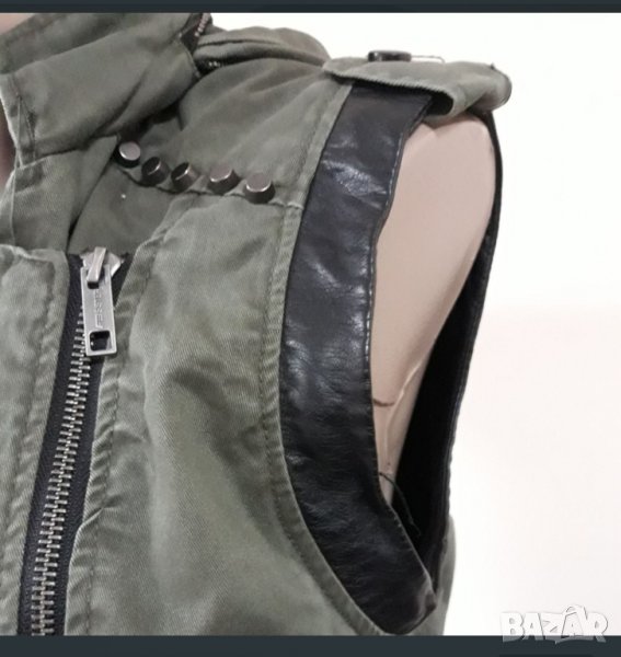 Елек в зелен цвят, има качулка на яката,която се прибира в яката, милитъри зелен цвят, подходящ за размер С/М. От металните елементи липсва един, има и кожени детайли.