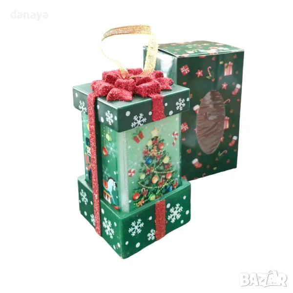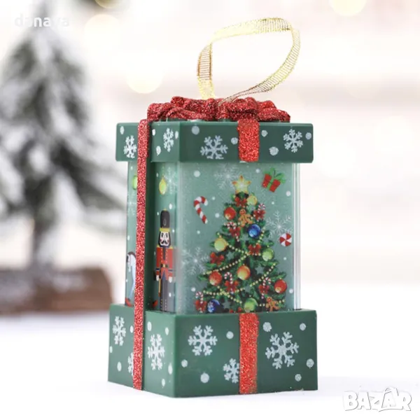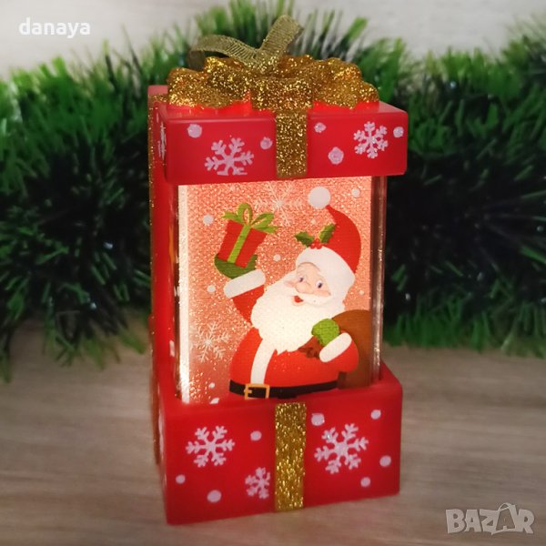 Коледна украса. Светещ коледен фенер с форма на подарък, а по стените му весело се усмихва Дядо Коледа или Снежко. Красива коледна декорация с връвка за закачане. Фенерите се предлагат в кутия, подходящи за подарък.