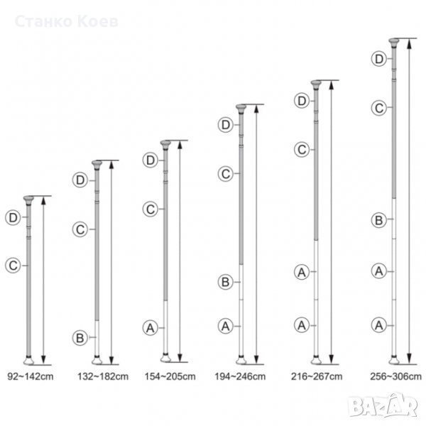 • Размери на телескопичната лента: Височина от 155 до 304 см
