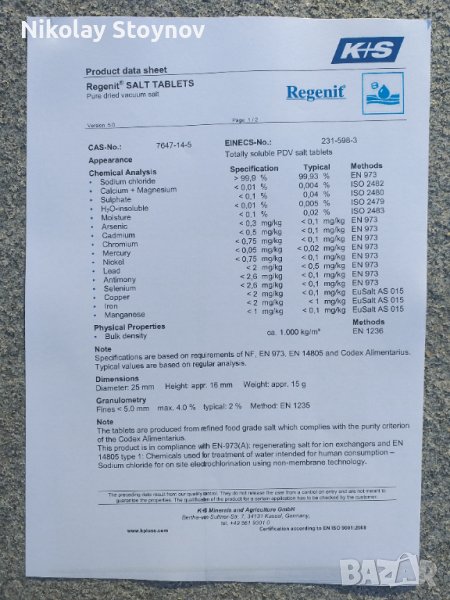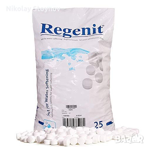 НАТРИЕВ ХЛОРИД на немската компания K & S - REGENIT! K+S AG (по-рано Kali und Salz GmbH ) е немска химическа компания със седалище в Касел . Компанията е най-големият доставчик в Европа на поташ за използване в торовете и след придобиването на Morton Salt , най-големият производител на сол в света. Фирмата също така произвежда и разпространява други минерални торове, като тези от магнезий и сяра . K+S е активен основно в Европа, Северна и Южна Америка с почти 15 000 служители по целия свят. НАТРИЕВИЯ ХЛОРИД на K+S, REGENIT изцяло от натурален , произведен и таблетиран, по специална патентована технология. Едно от основните му приложения е за омекотяване на водата. Правилната работа на омекотителните системи за вода зависи от качеството на консуматива, който се използва. За качествена регенерация е необходимо в таблетираната сол да няма примеси и да има високо съдържание на чист натриев хлорид над 97% по норма. Натриевия хлорид , който Ви предлагам е възможно най-качествената вакуумно изпарена натурална таблетирана сол в Европа. За постигането на чист натриев хлорид без примеси солта трябва да е получена по метода вакуумно изпаряване. В Европа само 2 завода могат да Ви предложат такъв вид консуматив, който ние ви предлагаме. При наличие на примеси в таблетираната сол могат да се запушат всмукателните механизми на омекотителя за вода и това да доведе до проблеми с работата на омекотителя. Високата плътност на пресоване на таблетката от 342 N/cm2 гарантира много по-ниската консумация на таблетирана сол спрямо други видове таблетирана сол предлагани на пазар.