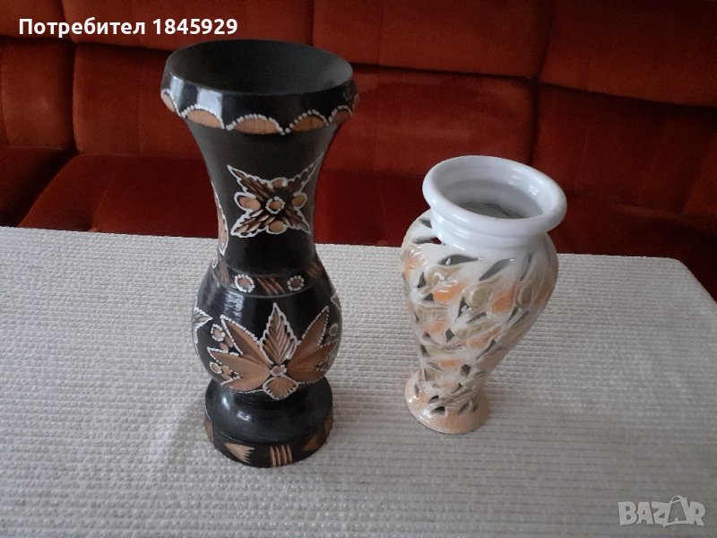 1. Ваза от дърво с дърворезба, обработена с длето и лак. Височина-35см.Диаметър- 40 см. Цена- 15 лв.