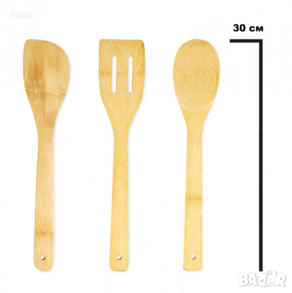 - 3 х бамбукови прибора за готвене: шпатула, лъжица, шпатула с отвори