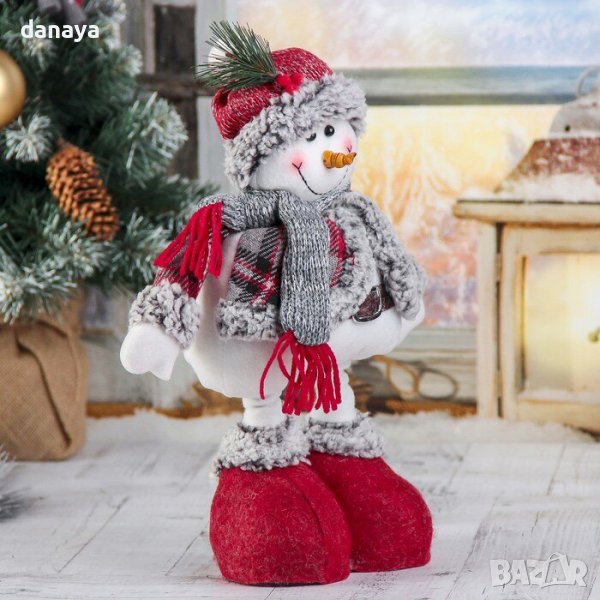 Декоративна коледна фигура от плат Снежко с разтягащи се крака. Коледна декорация, симпатична и красива! Прекрасен коледен декор, където и да го поставите. Снежко е с променяща се височина, когато е със сгънати крака, височината е 37см, а когато разпънете краката му, Снежко става висок около 58см. Направен от плат. Изработен от много мекичка и приятна на допир материя.