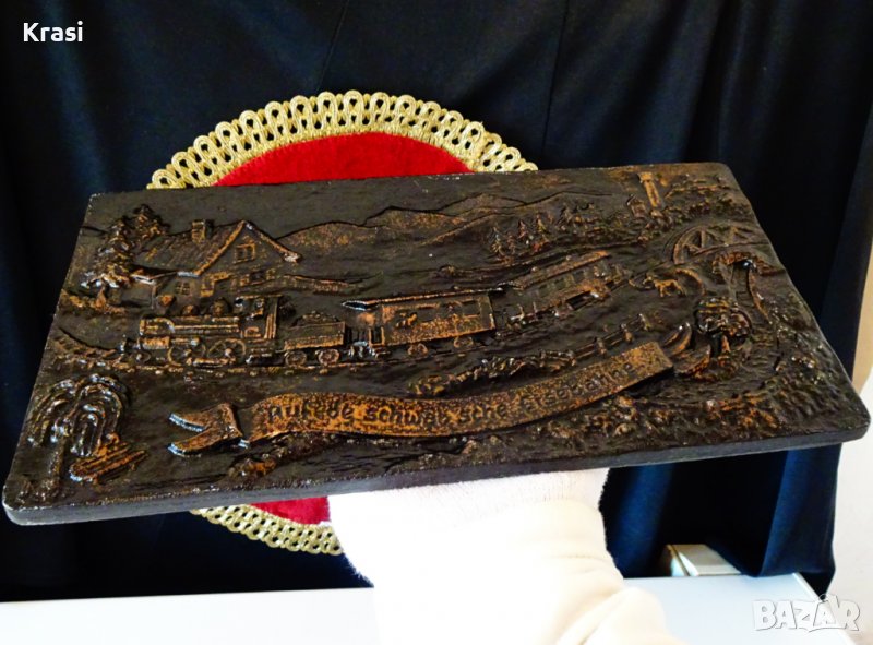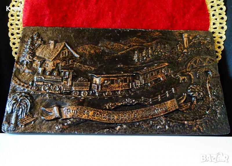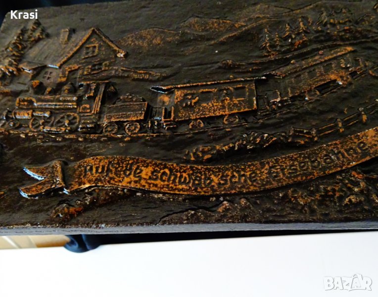 Немска релефна медна картина,медно пано с влак,който минава покрай китно планинско селце.Под влакчето е гравирано заглавие на немска песен за железниците "Auf der schwäbsche eisebahne" - много весела,безгрижна,която може да чуете в You Tube.Картината е с размер 30 х 17 х 1.5 см.Тегло 650 гр.