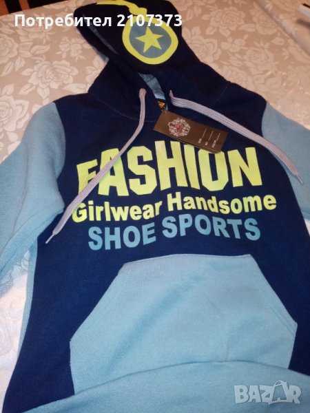 Продавам Нов ватиран суичер с долнище, подходящ за малка госпожица. Нов. С етикета. Размер S. Суитчерът е с качулка и джобове. Долнището е с дължина на крачола 78 см.