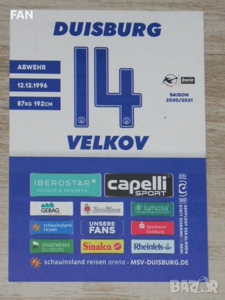 Предлагам оригинална футболна картичка с ОРИГИНАЛЕН саморъчно написан автограф с маркер на Стефан Велков с екипа на германския клуб Дуисбург от сезон 2020/21.