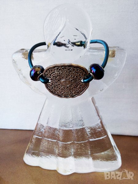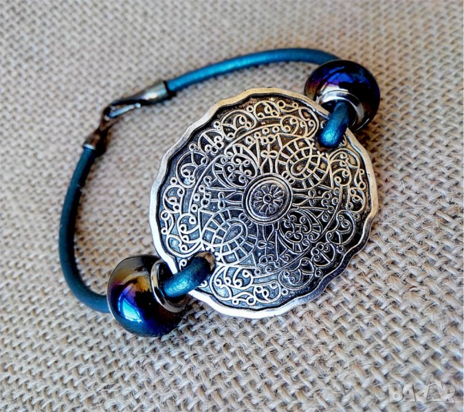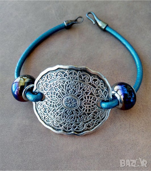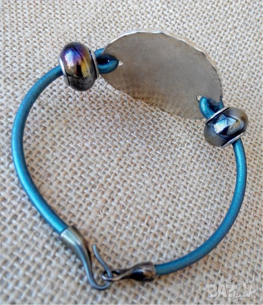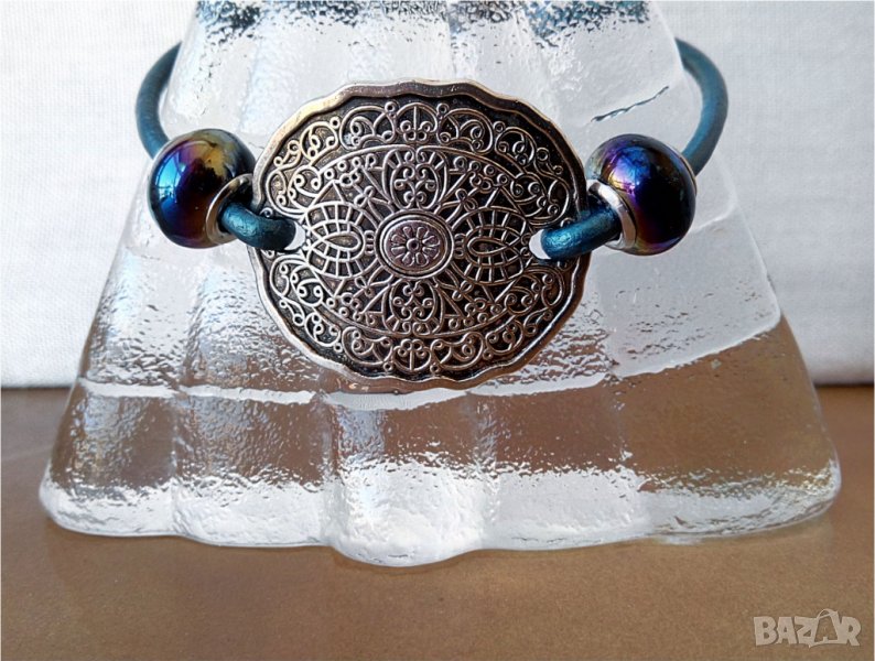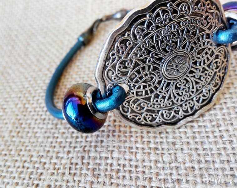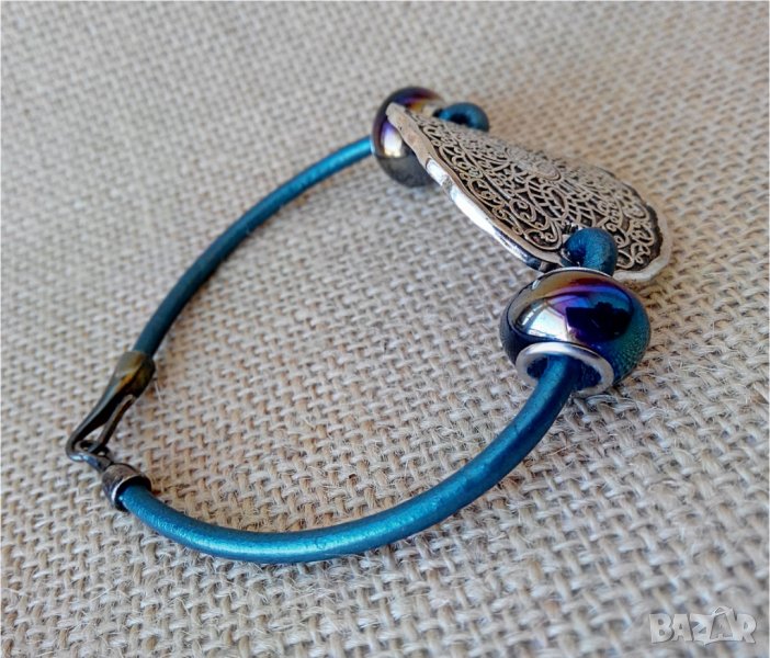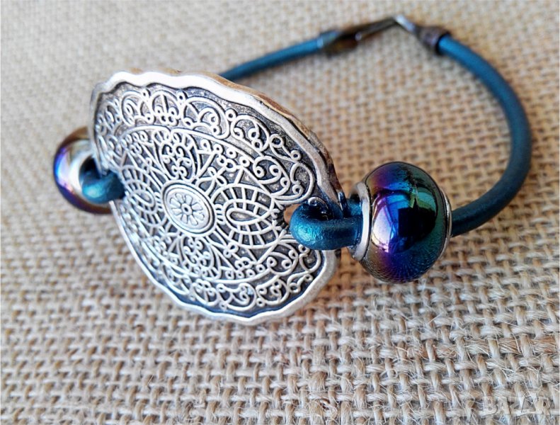 Фокусът на тази гривна е големият централен елемент-конектор (34x39 mm, антично сребро), който следва извивката на китката. Той е обграден от 2 порцеланови мъниста тип рондел (14x8 mm, цвят черен метал AB) със сърцевина от неръждаема стомана. 3-милиметровата кожена връв е перлено синя. Закопчалката е с ухо и кука и е с подобен на мънистата цвят. Гривната е с дължина 20.5 см и тегло 7 гр. Стилизираният