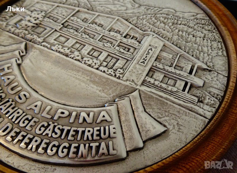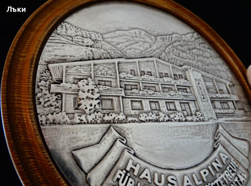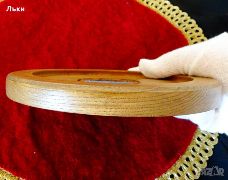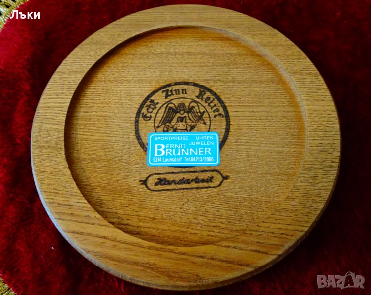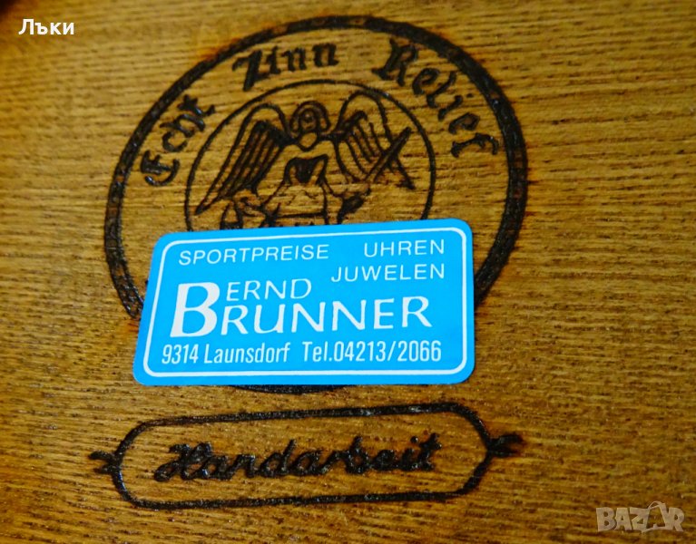 калай и 5% сребро.Има основа от плътно естествено дърво немски дъб.Запазен