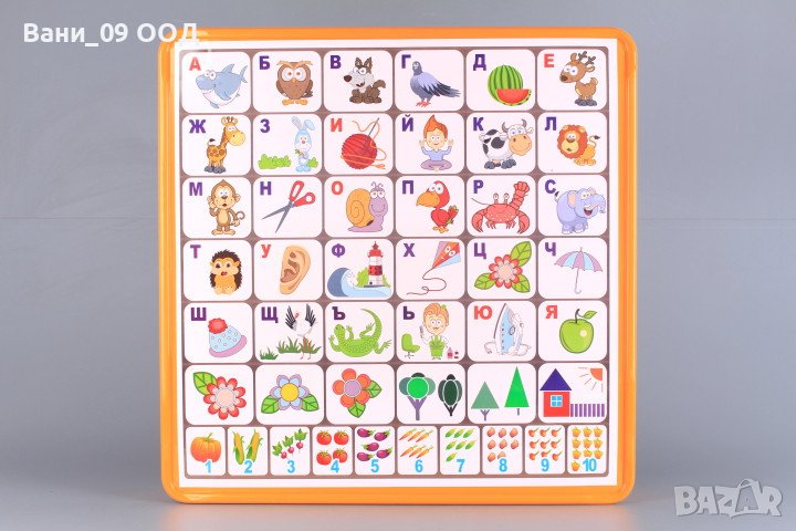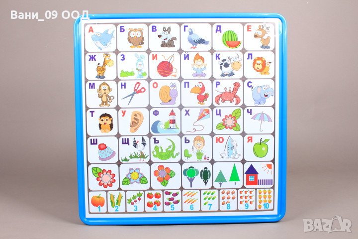 Плотът на масата е щампиран с българската азбука и цифрите от 1 до 10.