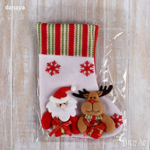 Коледен чорап за подаръци или декорация с фигура на Дядо Коледа и Елен отпред. С връвка за закачане на стена или врата. Прекрасен коледен декор! Коледният чорап е изработен от текстилни материали.