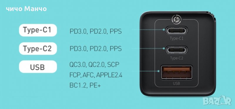 • USB 60W multi-protocol fast charge 5A PPS - поддържа Samsung fast charge протокол.