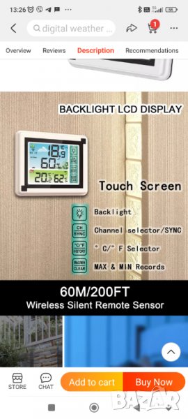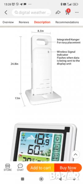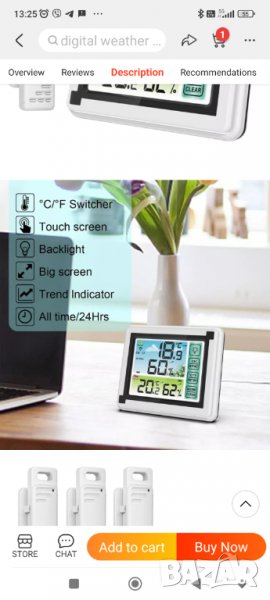 На закрито На открито Максимална минимална температура Рекордна влажност °C °F Монитор за времето Това е метеорологичен часовни с вътрешни датчици и външни станции, които ясно да показва температурата и влажността, лесен за четене, може да показва тенденциите на влажност и температура. Характеристики: Има функция за памет и може да записва най-високата и най-ниската температура и влажност. Могат да се видят исторически данни за температура и влажност. Има две високомагнитни железа в задните корпуси на главния двигател, които могат да бъдат прикрепени към метални предмети. Задната част на главния двигател е оборудвана със скоба за стоене в хоризонтално положение. Висока чувствителност, управление с докосващ бутон, лесен за работа. С подсветка, автоматично изключване на подсветката след 10 секунди без работа. Външното тяло може да бъде окачено чрез отвори за окачване или може да стои на хоризонтална равнина. Спецификации: Тип: 1,2 (по избор) Материал: пластмаса Предавател водоустойчив: IPX4 Диапазон на вътрешната температура: -4° F-158 °F (-20° C-70 °C) Диапазон на външната температура: -40° F-158 °F