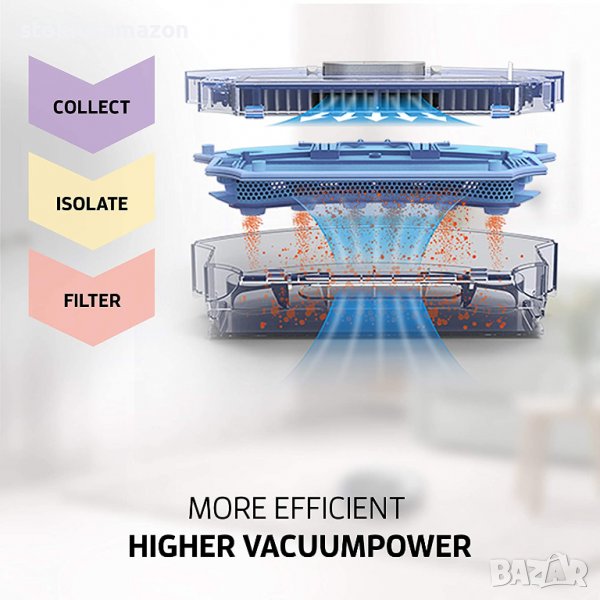 Приложение за смартфон с разширени функции: Прецизно лазерно картографиране на до 3 етажа/апартамента (мултикартиране), специфични за стаята планове за почистване, наблюдение в реално време, персонализирани зони за забрана, за ходене и килими, както и абсорбция, вода контрол на нивото и страничната четка.