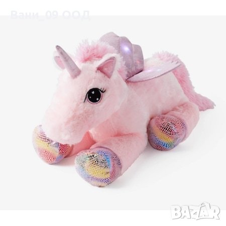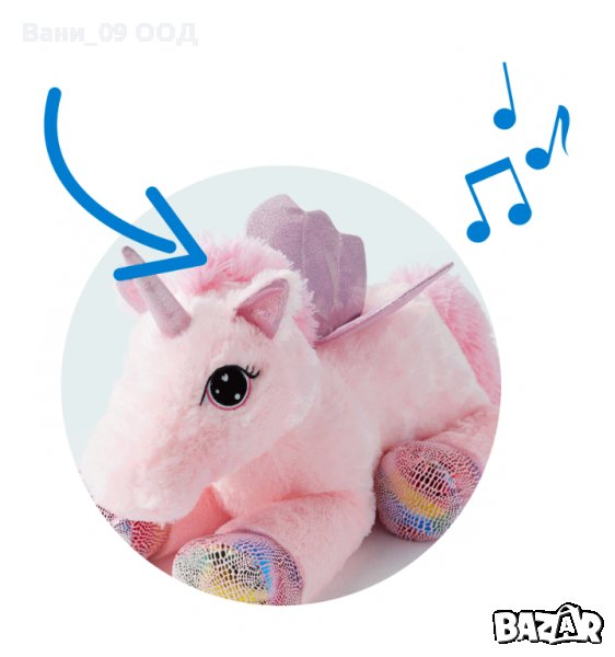 С натискане на бутона на лапичката му, еднорогът издава магически звук, а рогът и крилете му светят в ярки разноцветни нюанси!