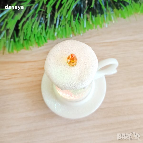 Малка електронна коледна свещ с височина 8см. Свещта свети в преливащи цветни светлини. Когато е изключена, свещичката е изцяло бяла, обсипана с блестящи частици. Работи с 3 АG13 батерии, които са включени в комплекта.