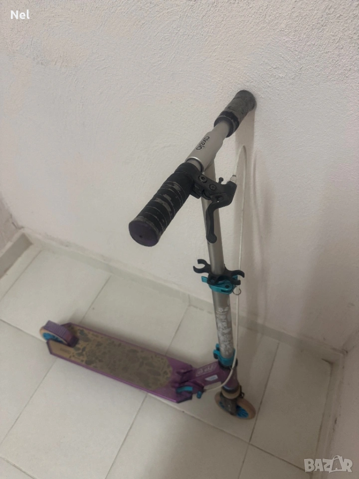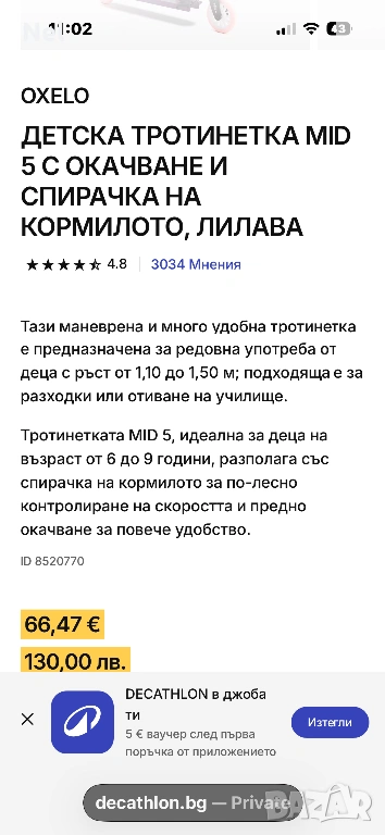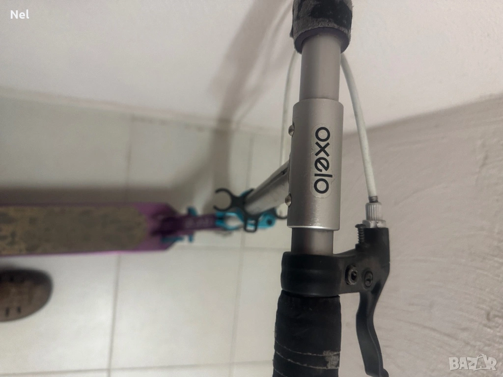 Запазена тротинетка OXELO MID 5,предназначена за редовна употреба от деца с ръст от 1,10 до 1,50 м, на възраст от 6 до 9 години. Разполага със спирачка на кормилото за по-лесно контролиране на скоростта и предно окачване. Купена от Декатлон.