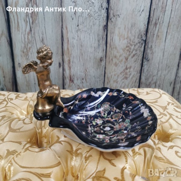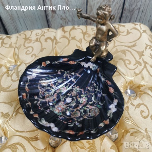 Мидата е изработена от състарен порцелан в черно, украсен с флорални мотиви, а за фигурката е използван плътен бронз с тъмна патина.