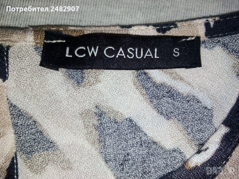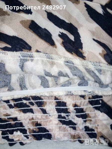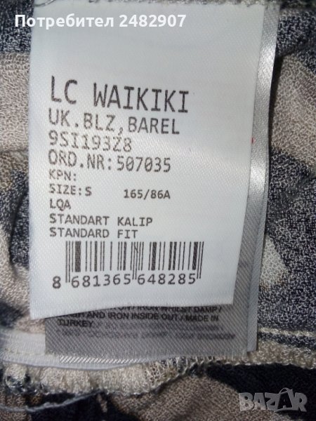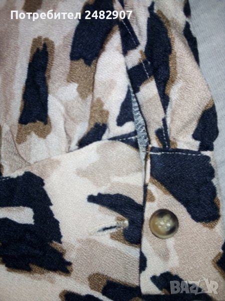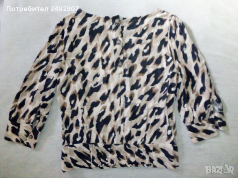 Дамска блуза, размер S. Обличана е веднъж за повод. Ширина в раменете - 38 см, ширина под мишниците - 47 см, дължина от рамото до долу - 53 см, дължина на ръкава от рамото - 44 см. Закопчаване - с 3 бр. копчета отзад, с копчета на ръкавите и ластик в средата на задната част на талията.