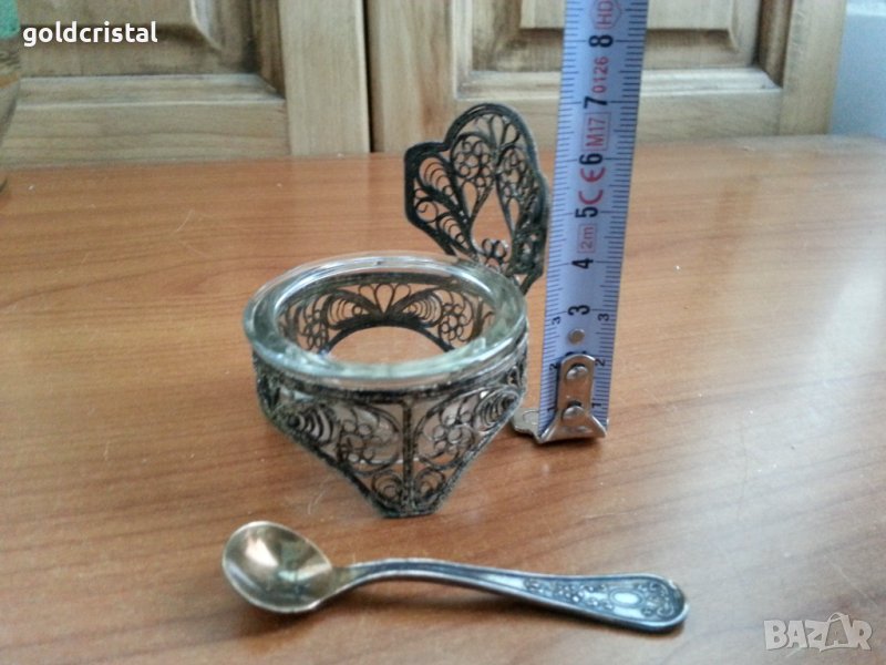 Стара руска солница или хайвер с посребрена лъжичка техника филигран нова в кутия-85лв без кутия -75лв сервиз комплект сет лот ретро арт декор винтидж колекция стари антикварни предмети обзавеждане за дома и семейството подходящи за подарък за ценители и колекционери