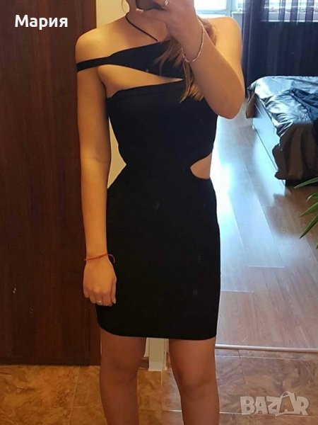 Бандажна черна рокля с интересно рамо → Обява 38740871