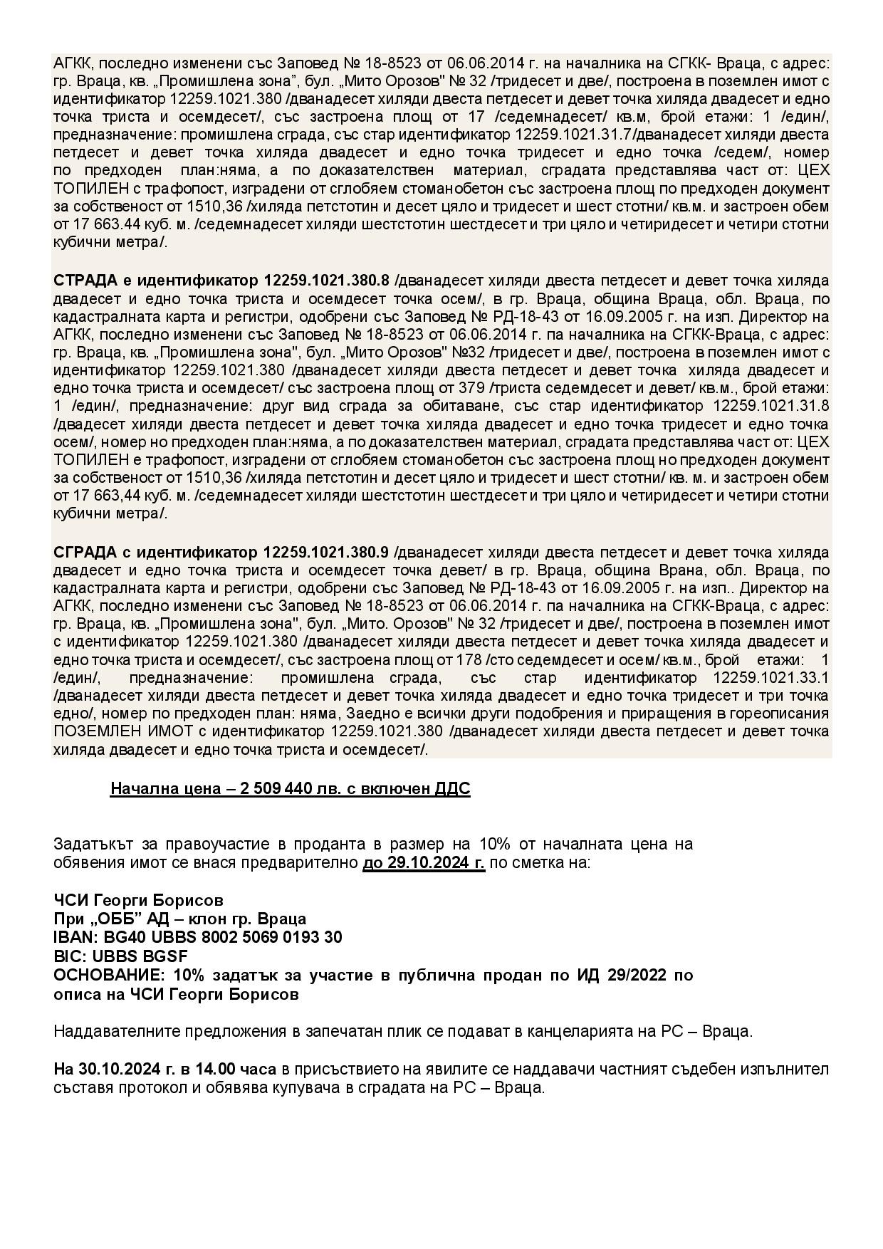 ЧСИ Георги Борисов с рег. 722 на КЧСИ, район на действие ОС Враца, е насрочил по ИД 20227220400029 публична продан /втора по ред/ в РС гр. Враца от 26.04.2026 г. до 26.05.2026 г., на следният недвижим имот, собственост на Био Инвест Енерджи АД, а именно: