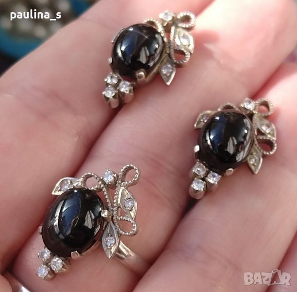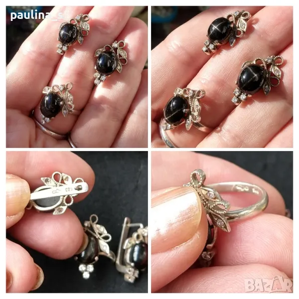1️⃣. Колаж / Винтидж / Много рядка находка! Цената е крайна 219,99лв / 105 евро. Стар семеен руски комплект от бижута с Черно котешко око (Черен диопсид), циркони и позлата. Позлатата е избледняла, но бижутата са без забележки. Виждат се светкавиците на камъните от слънчевите лъчи. Антика, със стойност, цената не се коментира!! Мащабирането е на дланта. Не се продава на грамаж! Пръстенът е с размер 17,6мм.