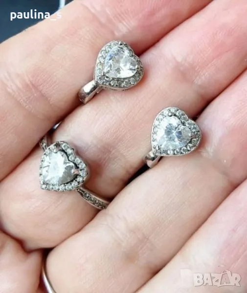 Пандора / Pandora, с висок клас циркони - ААА, във формата на сърца, в сребърен обков и вковани малки циркони. Двойно маркиран. Правен е по поръчка преди 23г. Реалната цена сега е по 30лв на камък, плюс среброто и малките циркони. Изработката е перфектна, изработен е по поръчка, в модел корона и тип принцеса. На пръстена липсва един циркон, може да се постави лесно при ювелир, с вътрешен диаметър 18мм. Съобразена цена! Моля, разгледайте и другите обяви и последвайте профила. Приятно разглеждане. Може да създадете пакет и да използвате доставката, тогава ще направя малка отстъпка от общата цена. При единична поръчка, цената не се коментира по никакъв начин, продажбата е с благотворителна цел! За лечение! Благодаря за вниманието и отделеното време 🙂