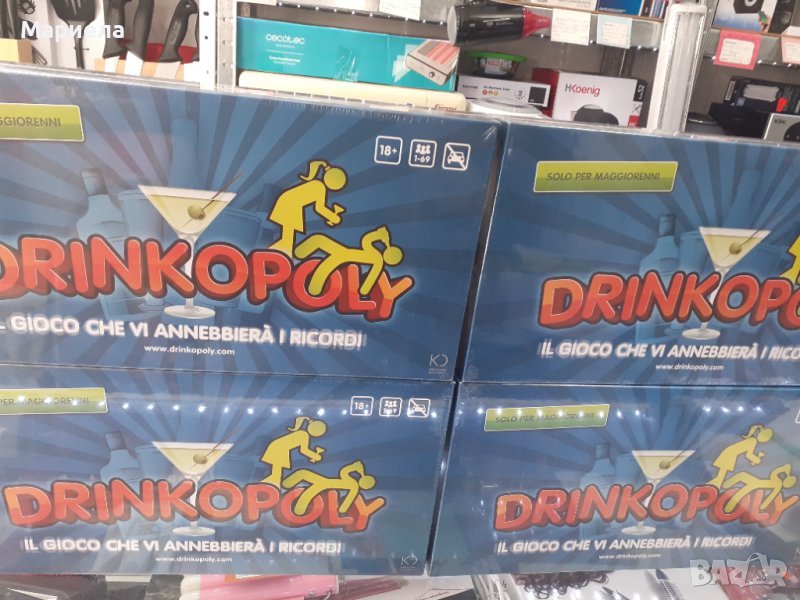Drinkopoly е социална и интерактивна настолна игра, предназначена за до 6 играчи. Гарантирайки часове забавление, смях и закачки, може да се играе у дома, на парти или на пикник.