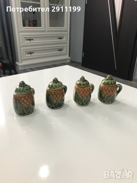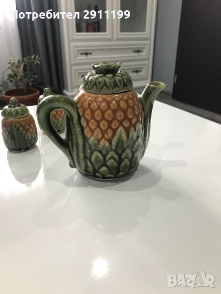 Стара , малка каничка с четири чашки с капачета. С растителни мотиви. Каничката е висока 13 см (с капачето ), чашките са високи 7,5 см( също с капачетата.Каната има малко отчупено парченце- моля вижте снимките( последната).Идеална за декорация , употреба, подарък или колекция. За още красиви предмети може да разгледате и другите ми обяви.