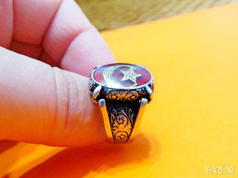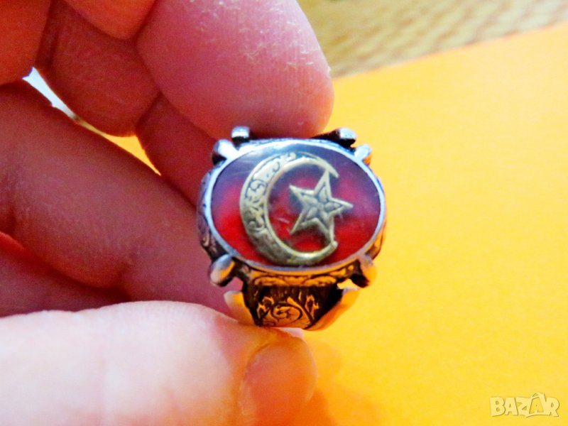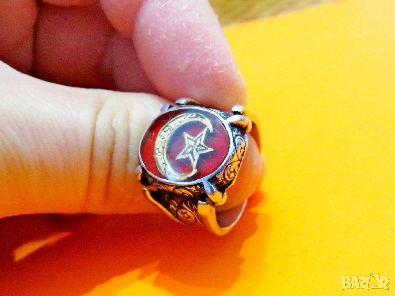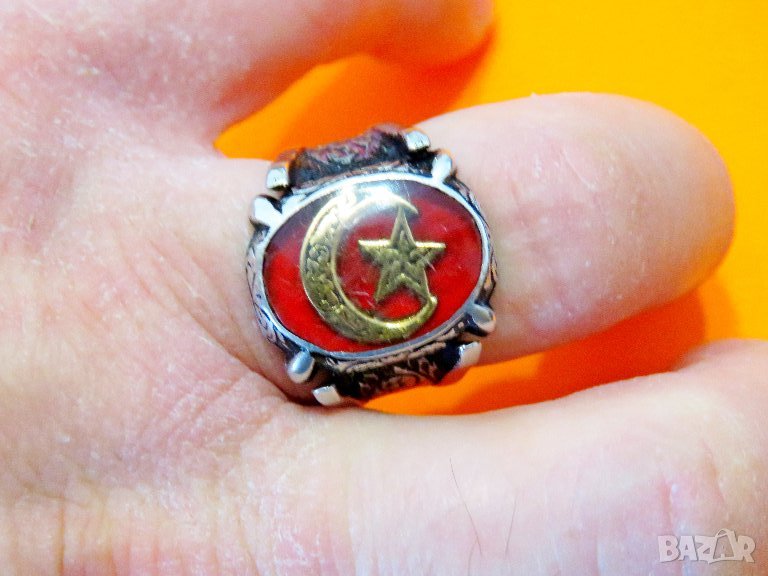мъжки сребърен пръстен с голем полумесецът и звездата, турски пръстен, османски пръстен, турция, флага на Турция .